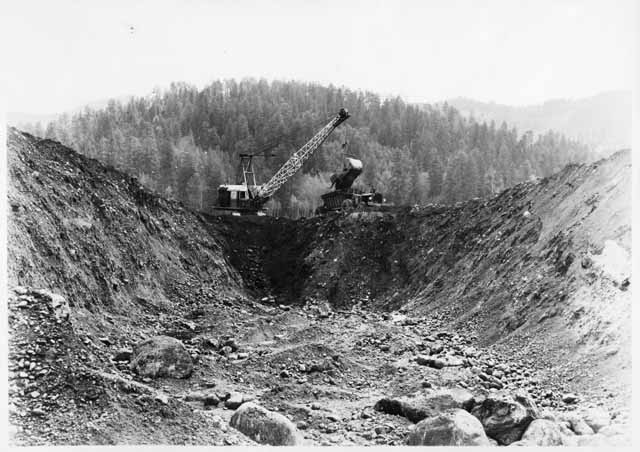 Dragline excavating in Borrow Pit No. 2, Area No. 1. Location 47+50/16+75. Material is being placed in zone 1 of the embankment. |