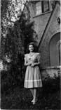 Subjects ~ Notes: Perkins, Nancy; ; ; ;   ~  Woman wearing a dress standing in lawn next to house.