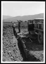 Installation of piezometer tips and copper tubing in No. 3 embankment in old river channel. Note back-filling over copper tubing, using fine screened clay to prevent crushing of tubing by rocks. |