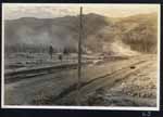 Looking toward left abutment from top of concrete mixing plant. Smoke is caused by clearing operations on left side of river. Material being rolled in foreground is the semi-pervious (No. 3) section of the dam. |
