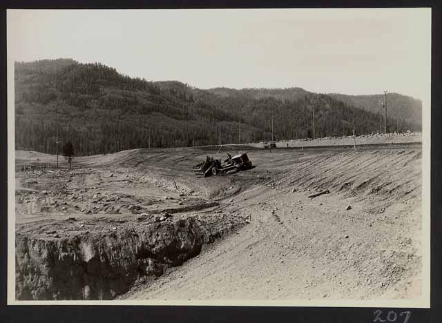 Looking toward left abutment along upward slope of embankment from sta. 37+25. Slope is being trimmed to grade with a Le Tourneau scraper. |