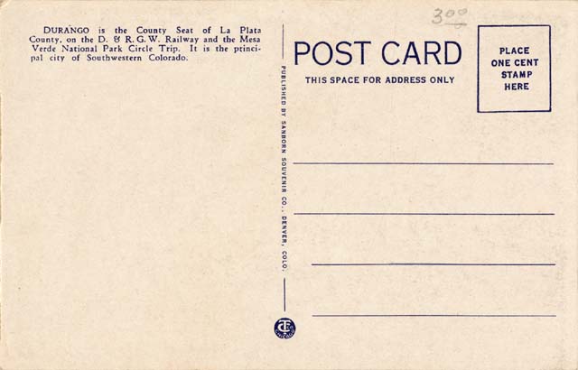 | Title: Post office (Durango, Colo.) | Year/era: 1945/1998 Photochrome | Call#: SWM 194, Vol. 1, item #277 | |