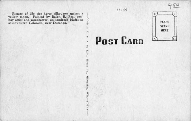 Title: Photograph of painting by Ralph E. Rea - Cowboy and horse silhouetted on moon. Year/era: 1945/1998