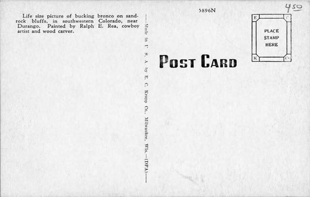 | Title: Photograph of painting by Ralph E. Rea - Cowboy riding a bucking bronco | Year/era: 1945/1998 Photochrome | Call#: SWM 194, Vol. 1, item #301 | |