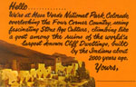 | Title: Hello, we're at Mesa Verde National Park, Colorado, overlooking the Four Corner country, seeing fascinating Stone Age Culture, climbing like a goat.. Year/era: 1945/1998 Publisher: Petley Studios Subjects: Call#: SWM 194, Vol. 3, item #365 | |