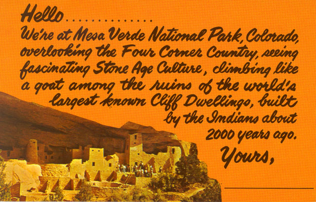 | Title: Hello, we're at Mesa Verde National Park, Colorado, overlooking the Four Corner country, seeing fascinating Stone Age Culture, climbing like a goat.. | Year/era: 1945/1998 | Call#: SWM 194, | |