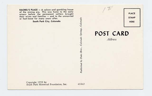 | Title: Rachel's Place, South Park City, Colorado. | Year/era: 1945/1998 Photochrome | Call#: SWM 194, Vol. 6, item #124 | |