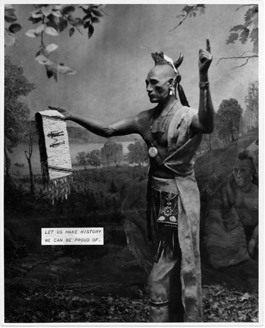 | Title: Mannequin of a Native American man holding a wampum belt on display | ||