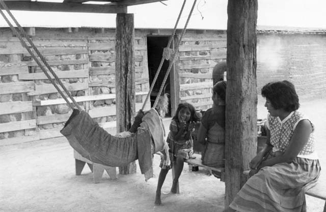 | Title: Two Tohono O'Odham women and a child near a hammock | ||