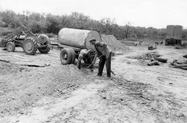 | Title: Two Tohono O'Odham men digging a pit to make charcoal | ||