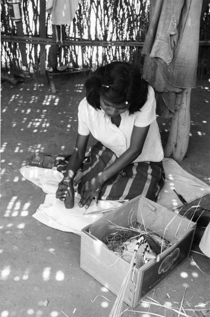 | Title: Young Tohono O'Odham girl sitting on ground making a basket | ||