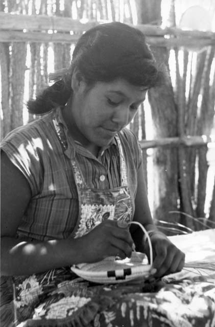 | Title: Young Tohono O'Odham girl sitting on a bed making a basket | ||