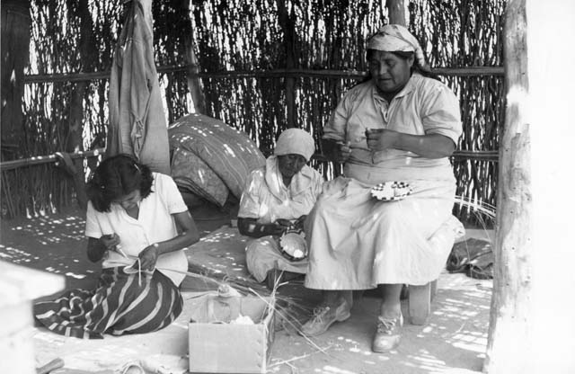 | Title: Young Tohono O'Odham girl and two women making baskets | ||