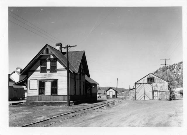 | Title: Rio Grande Southern Railroad depot (rear) and engine house at Dolores (Colo.) | Photoprint#: P026144 | |