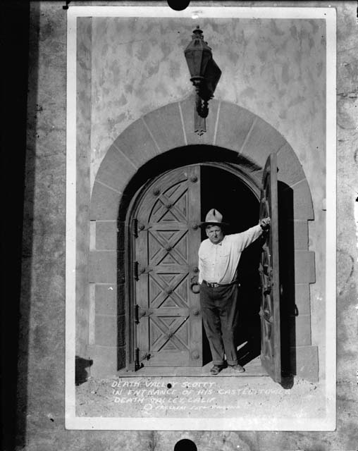 | Title: Scotty in entrance of his castle (Death Valley, Calif.) | Negative#: 2110 | |