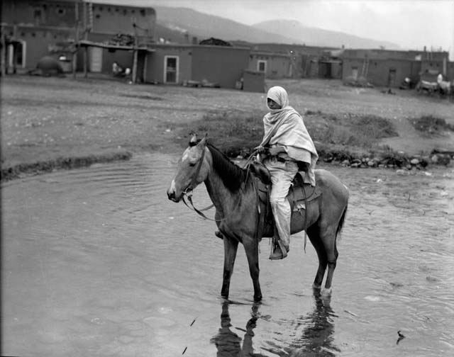 | Title: Man on horseback in water near Taos Pueblo (N.M.) | Negative#: 2120 | |