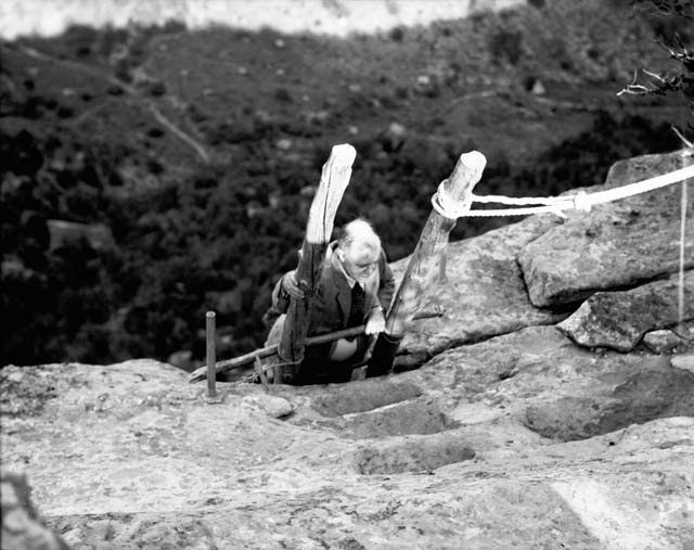 | Title: Climbing a ladder at Mesa Verde (Colo.) cliff dwellings | Negative#: 2339 | |
